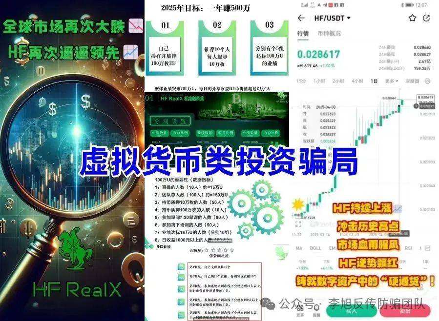 打着“区块链”的旗号,推出HF虚拟币,宣称Web3RWA赛道的投资机会,铸就数字资产中的“硬通货”,用户质押本金后,号称平均每天以百分之一的涨幅和每天千分之五的币息复利增长。该虚拟币项目采用传销模式发展下线,动静态收益结合,属非法金融活动,涉嫌传销。