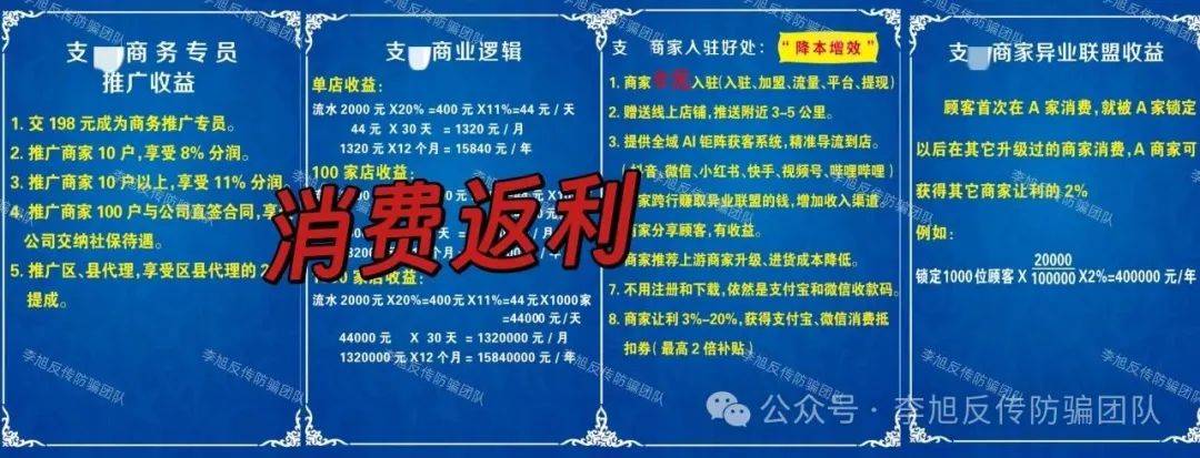 参与者需缴纳198元成为商务推广专员,推广商家达一定数量可享8% - 11%分润,推广100户可与公司直签并获社保待遇,推广区县代理能拿2%提成;商家0元入驻,获线上店铺、AI获客系统,可通过异业联盟跨行获利,分享顾客、推荐上游商家升级均有收益,使用支付宝/微信收款码,让利3% - 20%可获消费抵扣券,且商家锁定顾客后,顾客在其他升级商家消费,原商家可获2%让利。