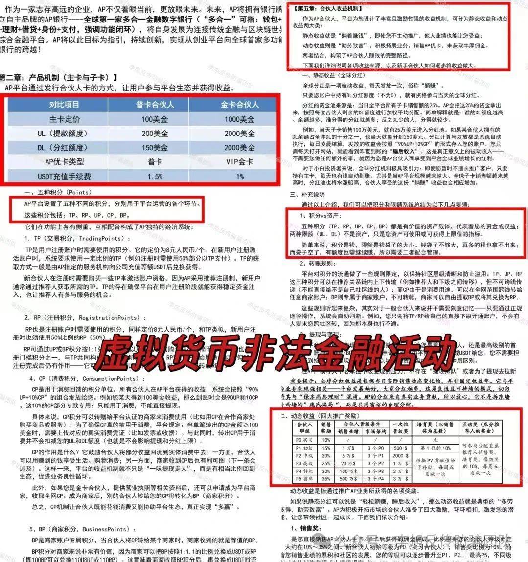 该项目要求购买主卡作为入门资格,通过动态收益鼓励“拉人头”拓展团队并按层级计酬,涉嫌传销;未经批准使用USDT等加密货币进行资金结算,属于非法金融活动;以“静态分红高达本金2倍”等承诺吸引投资,构成非法集资。