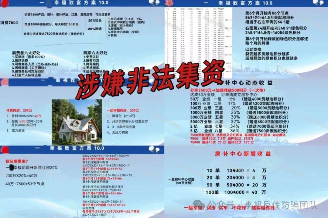 消费者支付7500元购买指定产品,除可获得等值实物产品外,还可获得1000绿色积分(每天释放100分,可增值)和7500贡献池积分,参与利润分红,按期分配。绿色积分可流通、增值、支付月供等。商家可免费入驻,享受拓客引流等权益。分享消费可加速积分释放。以“房补中心”为名设立多级代理体系,根据团队总业绩划分星级,享受不同比例的“动态收益”和贡献池积分奖励。