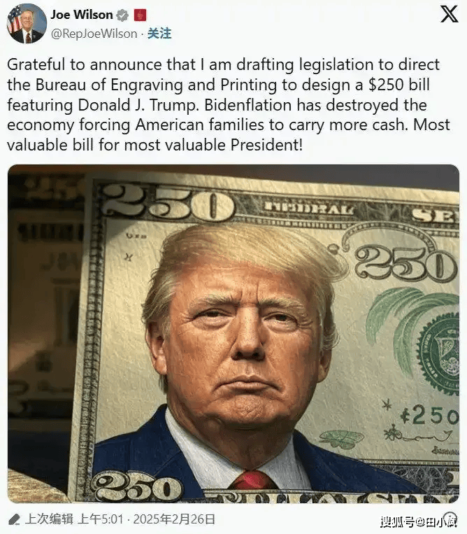 今年2月,众议员乔·威尔逊提议发行250美元货币,用特朗普的头像替代本杰明·富兰克林;